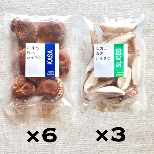 「冷凍の原木シイタケ 9pack」セット 収穫後24時間以内の新鮮な状態でカット加工して冷凍した商品が9pack入ったセットです 【内容】 ・KASA×6pack 軸を切り落とした傘です ・SLICED×2pack 軸を切り落とし約1cm幅にスライスしました ・CHIBI×1pack 小さなシイタケの軸を切り落とした傘です 【原木の冷凍シイタケ】 収穫後24時間以内の新鮮な状態でカット加工して冷凍した商品です 内容量:100g/pack ×9pack 保存方法:-18°以下で保存してください 賞味期限:収穫後6か月 凍結前加熱の有無:加熱してありません 加熱調理の必要性:加熱してください 使用方法:半解凍し、鍋や炒め物、パスタ、フライなど加熱してお召し上がりいただけます 産地及び加工地:長崎県対馬市美津島町洲藻 製造者及び加工者:べジのり 【原木シイタケ栽培とこだわり】 シイタケの原木栽培は、「伐木」することから始まり、「玉切り」した原木に穴をあけて種駒を挿れる「菌打ち」、菌を原木に巡らせる「仮伏せ」、シイタケの発生を促す「本伏せ」、という工程があります。 「伐木」してからシイタケを「収穫」するまでには約1年半の年月がかかります。 おいしいシイタケを収穫するために、木の状態や温度、湿度、風、日光の差し方などを見て、丁寧に一つ一つ手作業で管理して栽培しています。 そうした手間暇をかけて栽培した原木シイタケは、抜群に肉厚で風味豊かです。 【山で起きている課題へ挑戦】 原木シイタケ栽培のもととなる木は、切り株から芽が出て15~25年と成長することで山林は更新されていきます。こういった循環が、山林を管理することとなり、生態系を維持することにつながります。 しかし、現在対馬では管理しきれずに放置された山林が目立つようになっています。そこへ追い打ちをかけるように、激増したニホンジカによって、草や木の芽が食べられたりすることで、新たな木が更新されなくなり、さらには本来の山林の機能が働かなくなることで、土砂崩れや洪水などが頻発しています。 おいしい原木シイタケを食べ続けていけるように、木を適度に伐ったりシカからの被害を減らすことで、山林を守り続けたいという想いで栽培しています。 【冷凍で生まれる旨み】 生シイタケは鮮度が低下しやすいのが難点です。そのため、収穫後24時間以内に加工して冷凍することで、肉厚で風味豊かな原木シイタケを新鮮かつ身近にお楽しみいただけます。 シイタケは冷凍すると細胞が壊れることで酵素がよく働き、旨みや栄養素が増えるといわれています。 炒め物やソテーでは凝縮された香りを感じられ、鍋やスープでは旨みが口いっぱいに広がります。